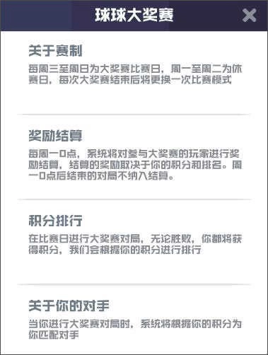 大奖赛每一周为一个比赛周期,每周的周三到周日是比赛日,周一和周二则是休赛日。每次大奖赛结束后,比赛模式都会更换一次。球宝们参赛的时候要留意比赛时间以及当周的比赛模式,可别错过了呀~
