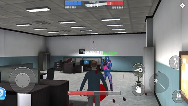 6、游戏开始后,顶部显示倒计时,底部为自身血量,若遭到寻找者攻击则会死亡。