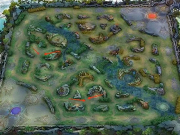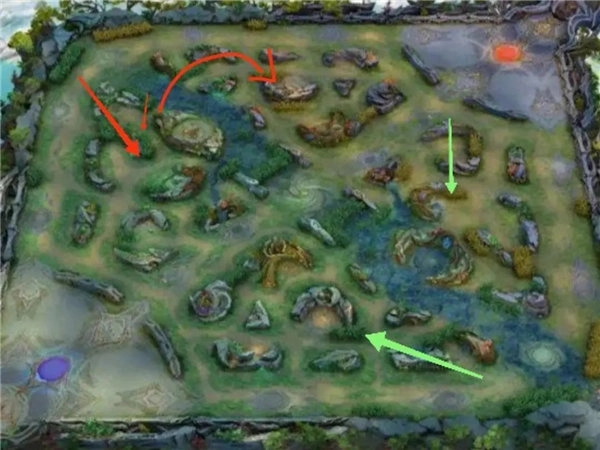 要是敌方打野前期能力较弱,或者他们的阵容整体前期强度不高且缺乏控制手段,那可以先把自家的弹簧花打掉,借助它跳到敌方红区(就是红色箭头标记的位置)。这时候别忘了给中路发信号,避免被对方反蹲到。