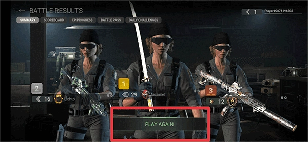 战斗结束后,你可以查看本局的战绩表现;要是还想再玩一局,点击“Play Again”按钮就能重新开始游戏。