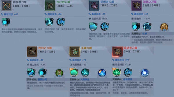 武器和圣物分为多个品质等级:白色<绿色<蓝色<紫色<橙色<红色,品质越高,提供的属性加成就越显著。蓝色及以上品质的武器会附加额外的副属性效果,而紫色及以上品质则拥有独特的被动技能。开局时尽量选择高品质装备佩戴,充分利用现有资源。