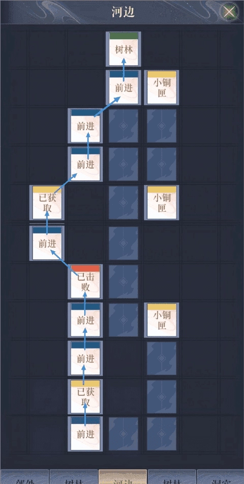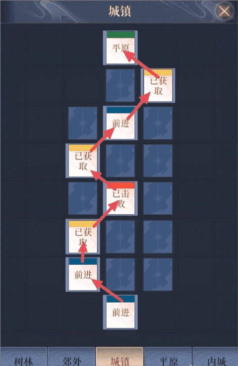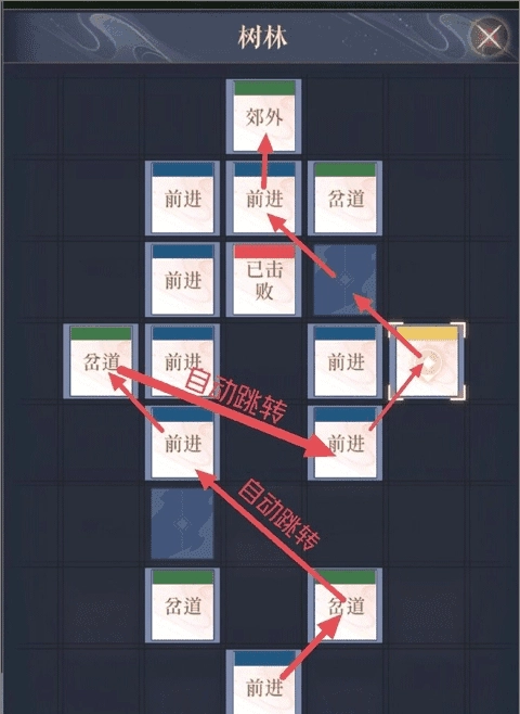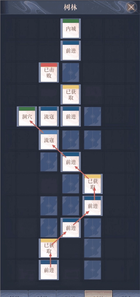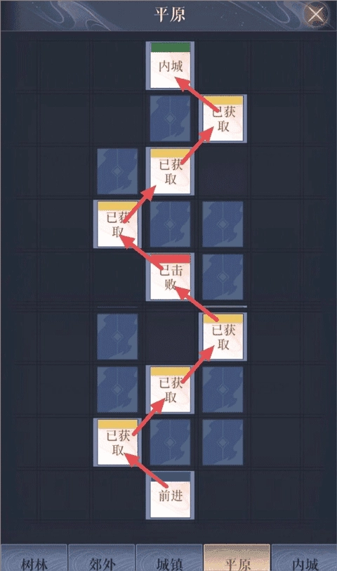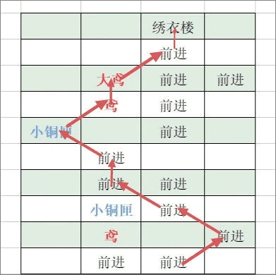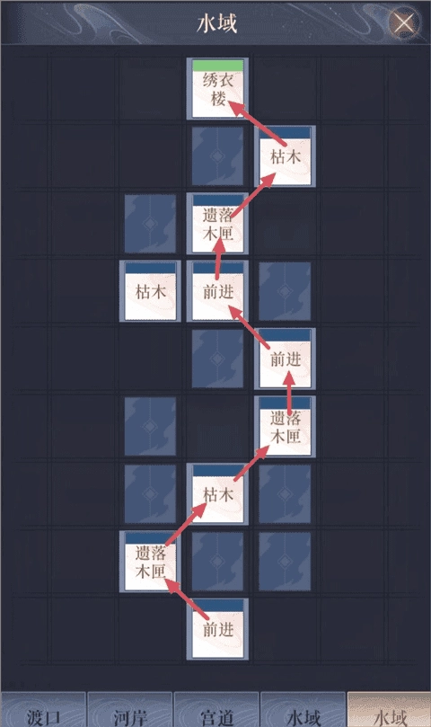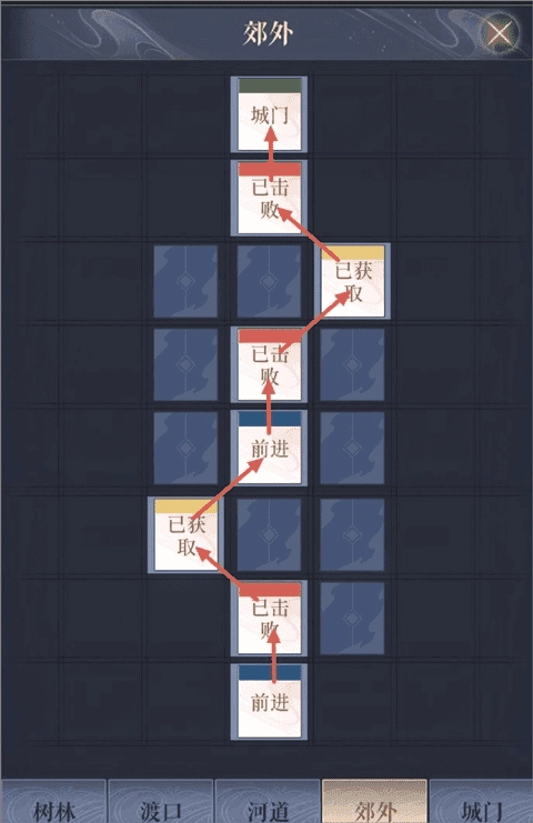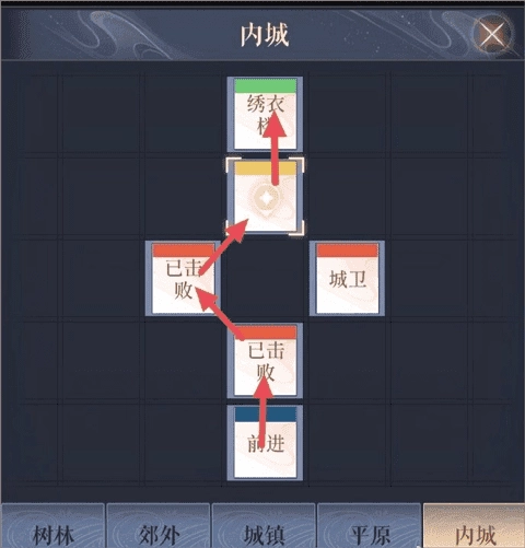 从郊外出发,先进入树林1,随后返回郊外,接着再次进入树林1,之后前往河边,再进入树林2,抵达洞口后进入内城,最终到达绣衣楼(终点)