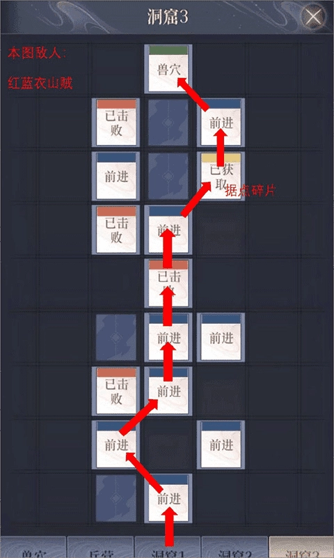 线路2(蓝):兽穴→洞窟2→兽穴→兵营→绣衣楼