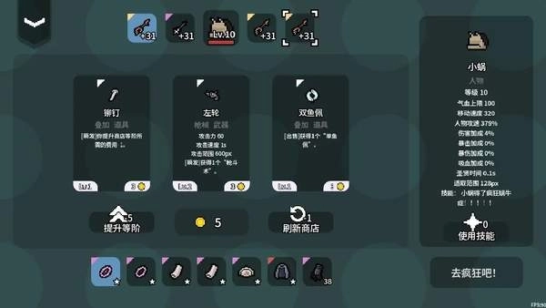 疯狂蜗牛症是一个非常吸引人的roguelike动作游戏,,游戏的画面简洁而精致,玩家需要通过合成不同的道具来提升自己的实力,运用智慧和策略去赢得每一场战斗,获得更多的武器,以便在激烈的战斗中生存下去。现在就这个游戏,体验这场充满策略和挑战的冒险吧!