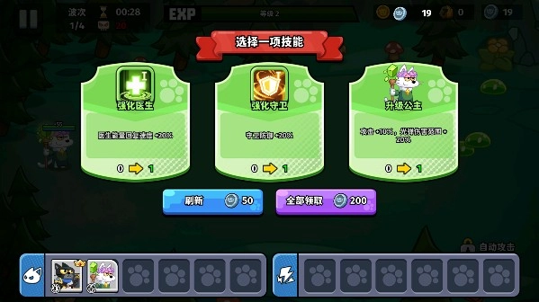 2、跨越50个充满挑战的关卡,面对不同难度的考验,不断提升实力。18名各具特色的猫咪英雄,12种升级流派,让玩家打造个性化战斗风格。
