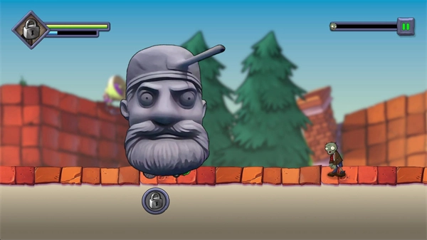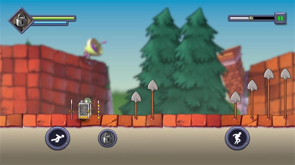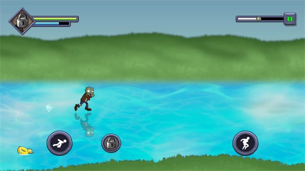 3、进入关卡后僵尸会自动移动,屏幕左右两侧的上下位置分别对应跳跃和切换方向的操作,部分情况下向下的按键会切换为冲刺功能。