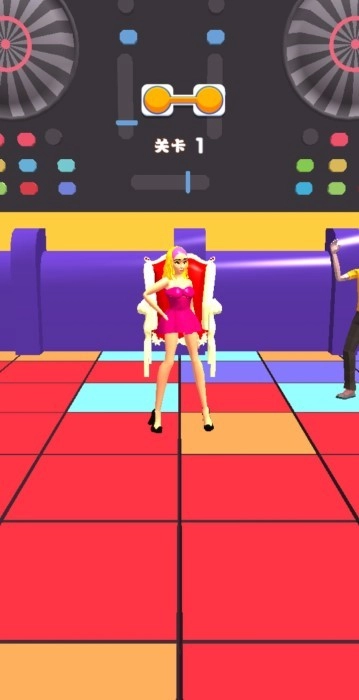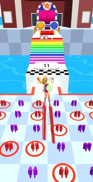 3、引导角色朝着红地毯尽头的彩色阶梯行进,途中灵活避开红色障碍物,保障行进顺利。