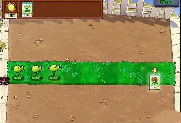 这是教程关卡,僵尸只会从一条路径出现。只要收集太阳并种好豌豆射手,注意别把豌豆射手种在右侧僵尸出现的区域(避免被直接攻击),就能轻松通关。
