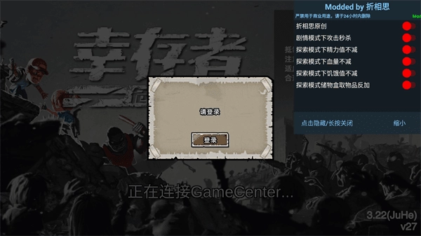 探索模式下:血量、精力、饥饿值不仅不会减少,反而会增加;物品从背包放入箱子时数量不会减少(可反复刷取);背包容量无限制。