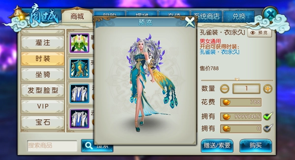 玩家可以在商城界面用元宝购买时装,购买前还能通过预览功能查看时装的实际效果。