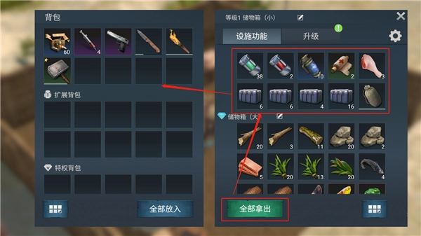 1、把现有的小型箱子清空内容后,不能直接升级成大型箱子,得先拆除旧箱子再重新建造。在整理物品的时候,玩家可以点击“全部拿出”按钮,把箱子里的物品快速转移到背包里,这样后续操作会更方便。