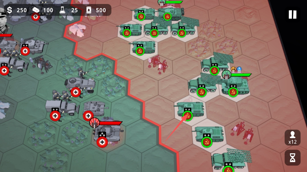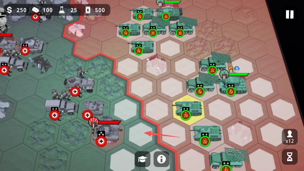 1、战斗时留意【绿色坦克】的所在位置,按照箭头的指示来调配单位,借助六边形的格位逐步推进,对敌方阵地形成压制。