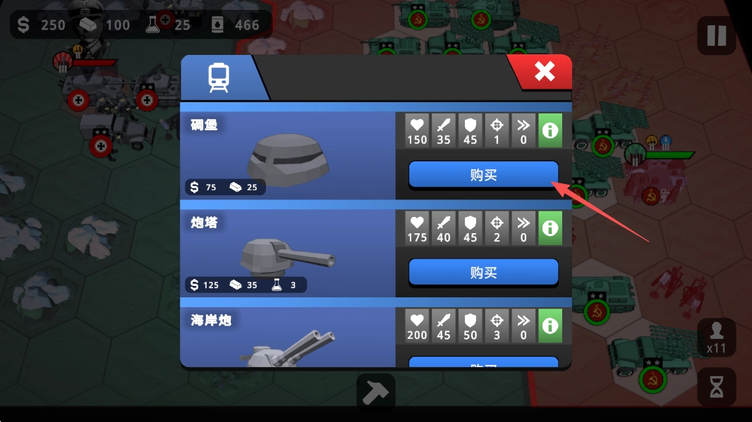 3、消耗【$75-25】资源购买【碉堡】,借助防御建筑搭建阵地,增强部队的生存能力与反击能力。