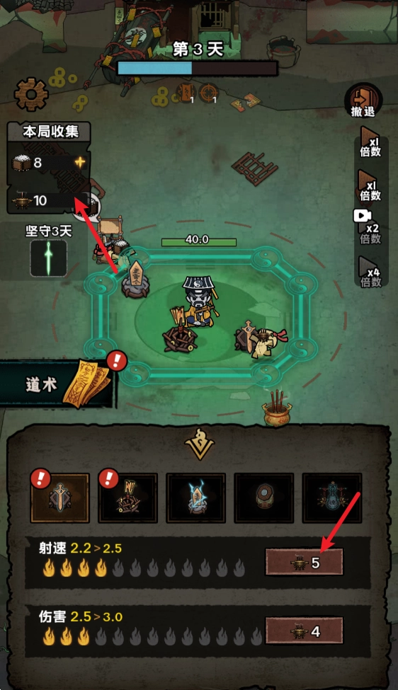 6、道士的上方显示的是自身血量,一旦血量降到零,撤退就会失败,并且会损失一部分已经获得的资源。
