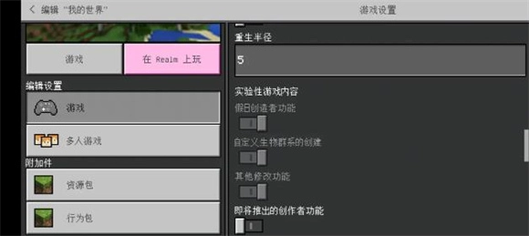 4、接着点击编辑设置中的游戏选项,向下滑动页面,找到实验性游戏内容板块,开启前三项功能;若不开启,模组内的物品可能无法正常显示。