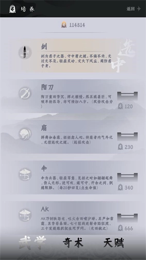 点击“培养”按钮,可消耗已获得的金币解锁新的奇术与武学,同时也能对天赋进行升级。