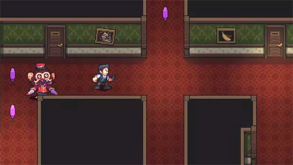 7、益智向右走到尽头乘坐电梯上二楼,收集所有散落的紫水晶,不过得留意会有猴子怪物追赶你,而且不止一只,你要灵活地移动位置,抓住机会找藏身的地方,躲开它们的追杀!