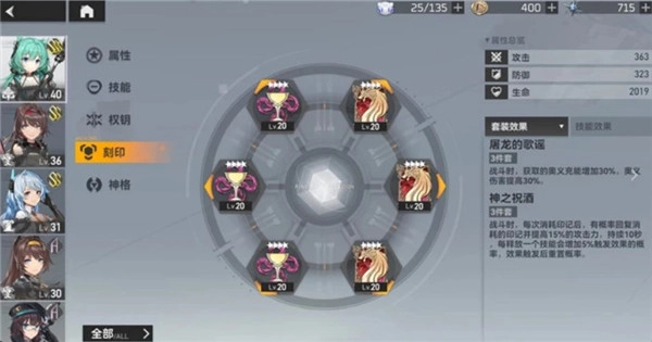 雏心的刻印搭配推荐屠龙的歌谣三件套与神之祝酒三件套:屠龙的歌谣能提升战斗中奥义充能的获取效率,同时增加奥义伤害;神之祝酒则具备双重效果,一是每次消耗印记后有概率恢复印记并提高攻击力,二是释放技能的次数越多,后续恢复印记的概率也会相应提升。这套刻印组合可强化雏心大招的伤害输出,显著增强她的整体战斗能力。