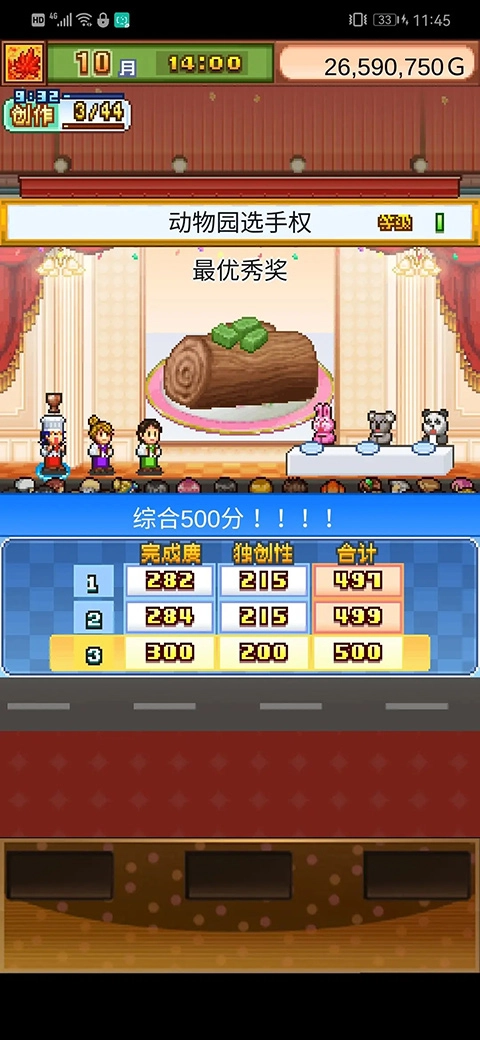 接下来动物园杯1级,因为动物园杯的三围要求极高,完成度很难达到360,所以最好是靠独创性(具体来说,这时三围上限999,完成度360需要三围2200,这意味着你至少需要到品质150的花田牧场才能让三围超过2200,然而光靠999上限要刷到花田牧场这个过程很漫长,除非你是肝帝,那还不如想办法提升独创性),万能配方在10级第三产地制作独创性可达200,足以过动物园杯1级(对手总分在500左右,但有时会超过500,重复比赛多次直到对手分数低于500即可,当然肯定也有办法让自己的独创性高于200)。