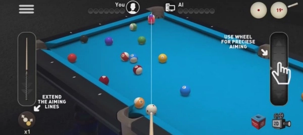 1、玩家通过拖动与调整球杆方向和力度完成击球,可细致控制出杆速度与击球点,影响母球路线。