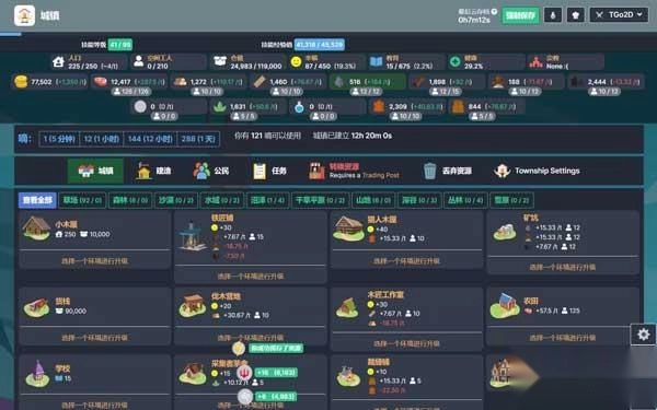 别的不多说,需要单独聊的是那个嘀,即tick的诡异翻译,城镇的时间不会自动流逝需要消耗tick手动操作,资源项都在储量后表明了每tick的增量,消耗tick资源就会进行对应的增减变化,需要注意的是你的仓储,仓储堆满后再消耗tick就会浪费,所以请及时扩大仓储和消耗或丢弃资源。tick每过一定现实时间自动获得,其速度和你城镇发展的水平正相关。