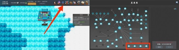 界面右上角打开星图,使用星石碎片加点,星石碎片获取方式:主线/支线任务、悬赏任务、副本黑市购买、副本乞丐奖励、副本小游戏、大地图随机刷新、好感度达标后索要(第三章霁月谷的师太碎片有每5天刷新一次)。