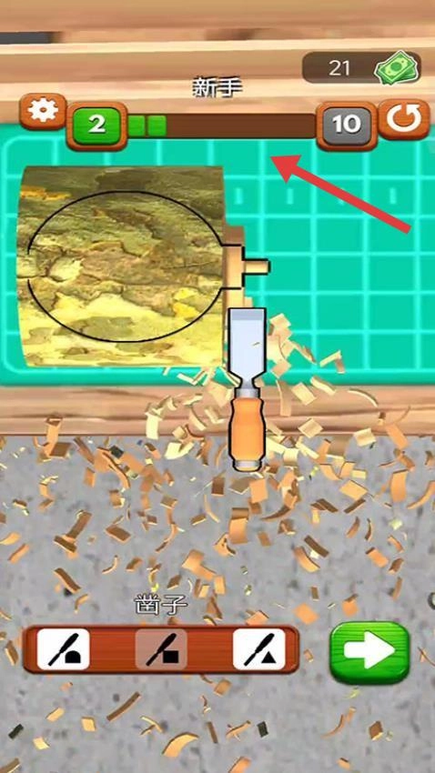 2、使用【凿子】专注雕刻,观察木屑掉落,逐步提升进度条,完成雕刻任务。
