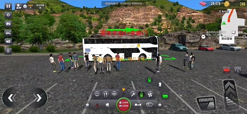 驾驶巴士抵达导航所指的特定地点后,按下开启车门的按钮,保持车门打开状态,静待乘客进入车内。