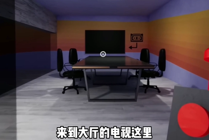 之后在大厅的座椅上找到录像带,接着拿到大厅的电视处播放。