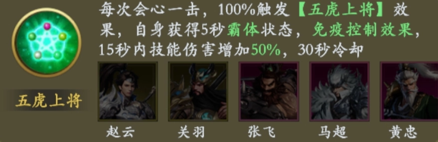 效果:每次触发会心一击时,将100%激活【五虎上将】效果——自身进入5秒霸体状态,期间免疫所有控制类效果;同时在接下来的15秒内,技能伤害提升50%。该效果的冷却时间为30秒。