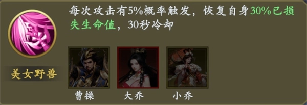 效果:每次攻击时有5%的概率触发该效果,触发后将恢复自身已损失生命值的30%,且该效果存在30秒的冷却时间。