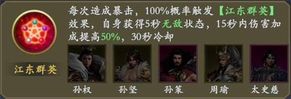 效果:每次触发暴击时,将以100%的概率激活【江东群英】效果——自身进入5秒无敌状态,同时在15秒内获得50%的伤害加成,该效果的冷却时间为30秒。
