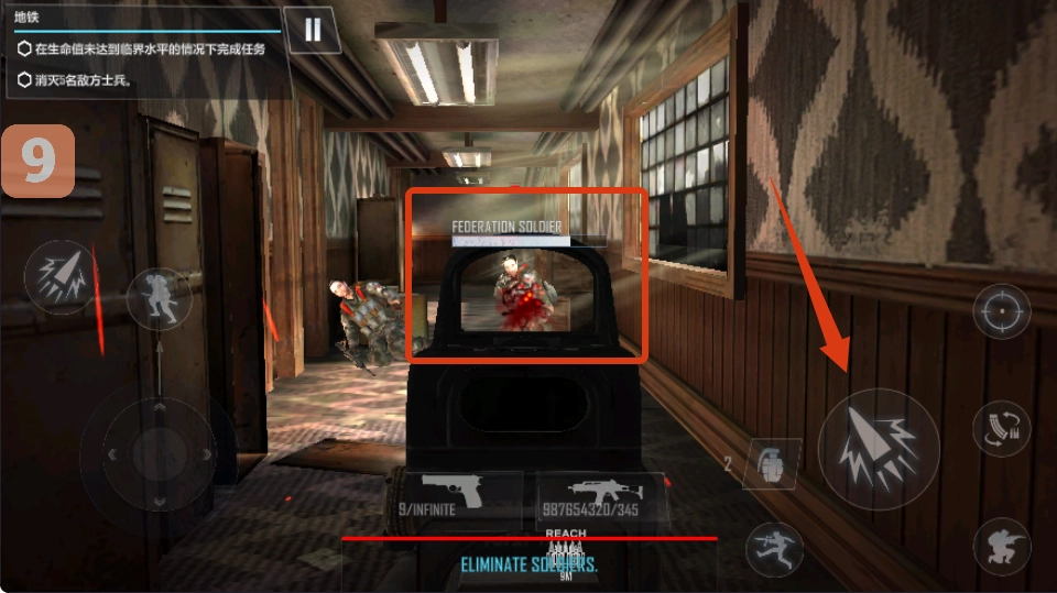 当与敌方士兵(例如联邦士兵)相遇时,使用武器进行瞄准和射击,歼灭敌人,达成击杀指标,从而顺畅地推动任务进展。