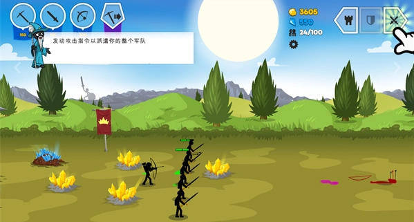 还能组成火柴人阵容,这时候,点击右上角的全体进攻图标,所有火柴人就会朝着敌人发起进攻。