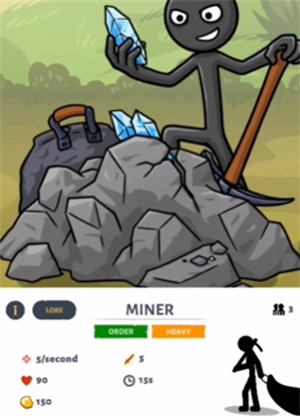 既然是塔防游戏,自然少不了靠自己的兵种来推塔,所以游戏里设置了矿工、剑士、弓箭手、法师、矛士、巨人这几种职业。