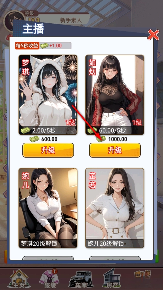 点击【主播】,去解锁和升级各种主播