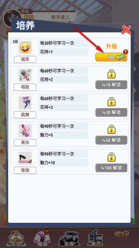点击【培养】,升级角色各种技能