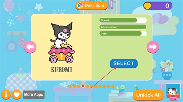 可以解锁三丽鸥家族的凯蒂猫、玉桂狗、布丁狗等角色,每个角色都有专属赛车,像羊角面包车、鳄鱼车这类造型独特的车型,它们还具备不同的性能特点。