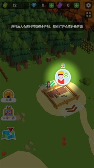 当钞票数量充足时,点击仓库升级界面,之后就能雇佣一名伐木工来协助你。