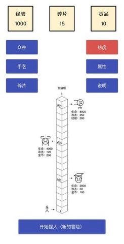 《女娲捏人》是一款植根于神话传说的文字角色扮演游戏,核心玩法聚焦于角色的创造与强化。玩家借助独特的捏人系统为角色赋予初始特质,之后便可指挥这位亲手塑造的英雄,向一座遍布未知挑战的高塔发起攀登。高塔的每一层都盘踞着形态与能力各不相同的魔物,随着层数的攀升,敌人的威胁程度会以几何级数不断加剧。这就需要玩家在战斗中获得各类祝福与技能后,进行深思熟虑的组合搭配,同时利用击败敌人所积累的资源来永久提升自身手艺,最终打造出能够从容应对终极考验的完美造物。