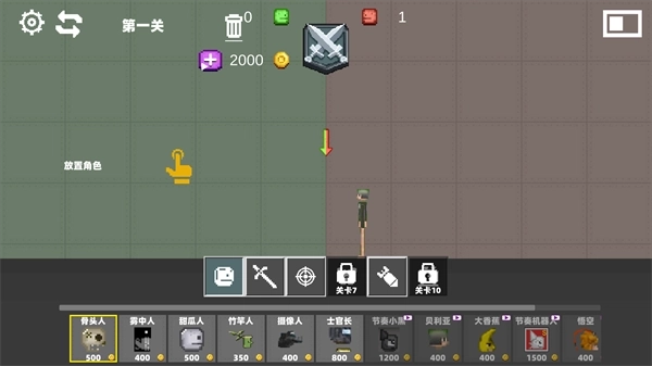 4、我们从第一关开始挑战,先点击下方选中单位,接着点击屏幕中间偏左的位置放置单位,同样的操作也能用来给角色配备武器。
