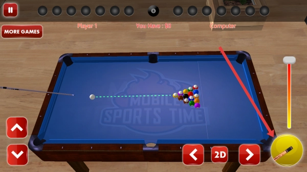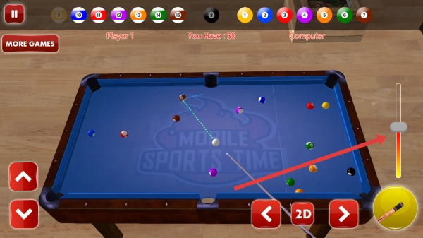 击球时,重新确认发力大小与瞄准角度,撞击母球;通过拖动滚动条来调节击球力量,遵循8球规则击打目标球,全力争取比赛胜利。