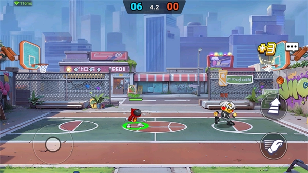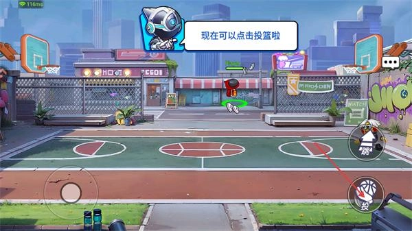 2、成功抢到篮球后,根据指引点击右侧的投篮按钮,完成投篮动作,争取把篮球投进篮筐来获得对战分数。