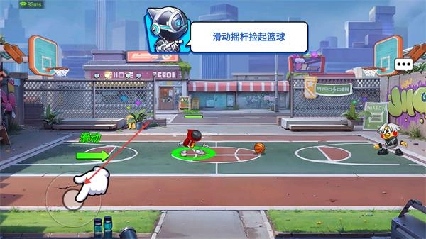 1、这是篮球对战游戏的环节,按照提示滑动左侧摇杆,控制角色移动到篮球所在的位置,完成抢球动作来取得对战中的球权。
