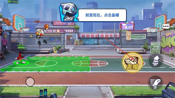 3、当对方做出投篮动作时,找准时机点击右侧的盖帽按钮,完成盖帽操作,以此干扰对方投篮,防止其得分。