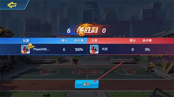 4、对战结束后会进入胜利结算页面,在这里你可以查看双方的得分、命中率等各项数据,点击返回按钮就能回到游戏主界面。