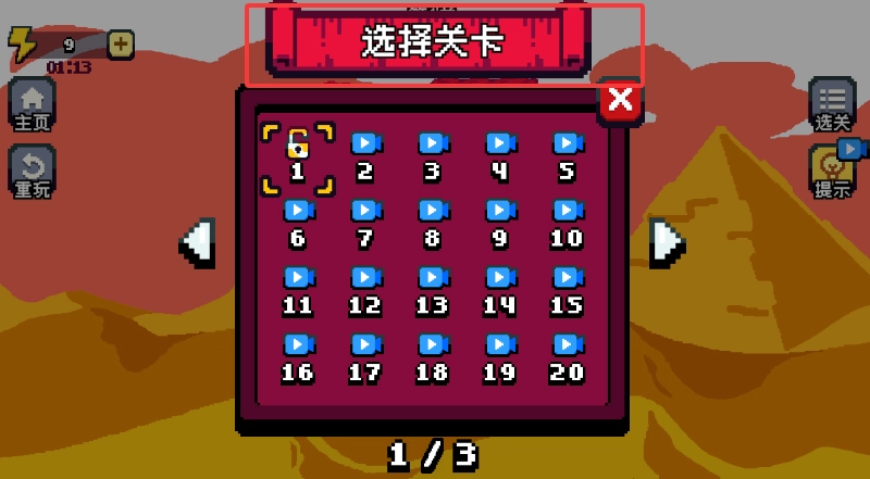 选定模式后,即可进入关卡选择界面,界面上的每个方格都对应着不同难度级别的挑战内容。