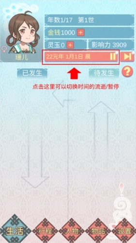 3、接着进入角色界面,在图示位置能够切换时间的流逝状态或暂停时间。
