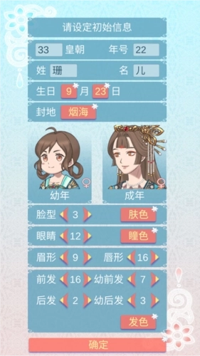 1、在游戏初始界面,选择并设置好人物的各项属性,以及姓名、年号等相关信息。