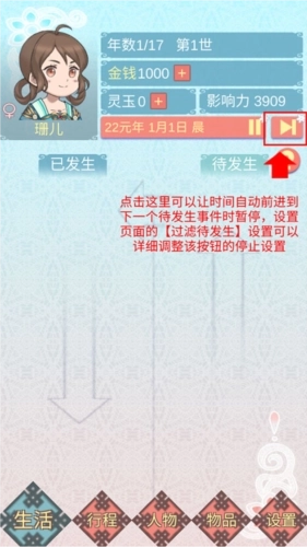 4、右侧按钮能让时间自动推进至下一个待发生事件时暂停,设置页面中的【过滤待发生】选项可对该按钮的停止规则进行详细调整。